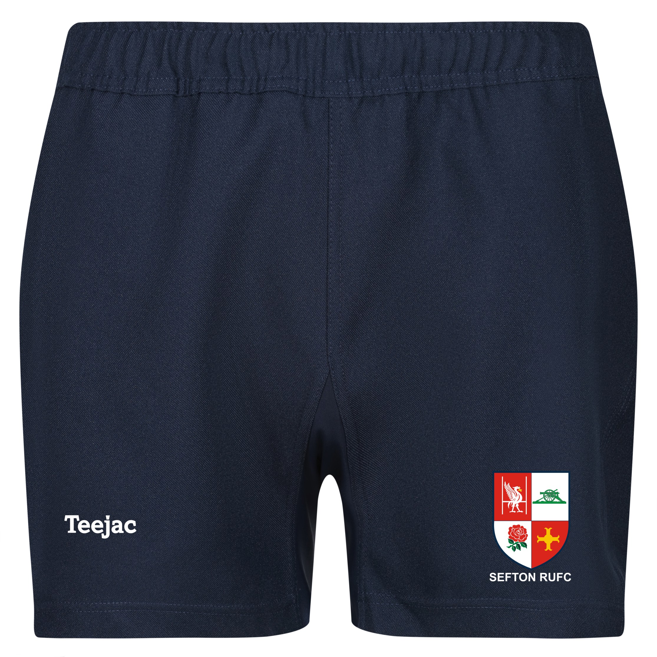 Sefton RUFC Rugby Shorts. In Navy with Club crest embroidered on left leg.